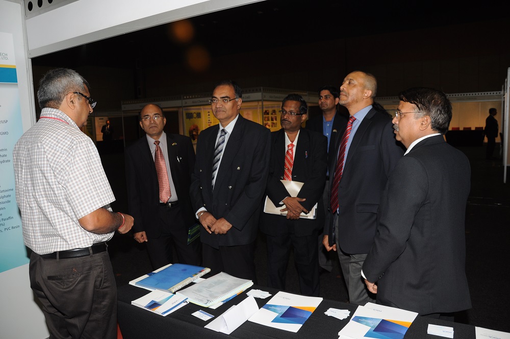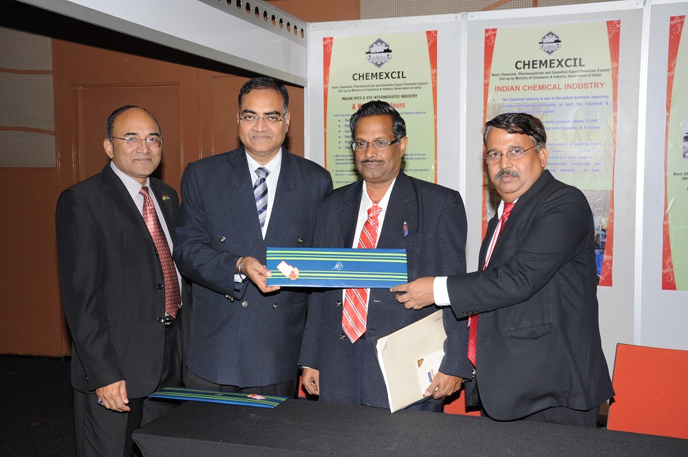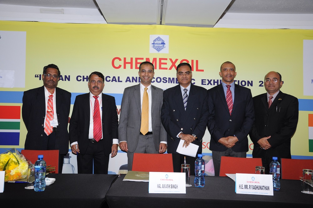 Dignitaries at the Indian Chemical & Cosmetics Exhibiton held at the Durban ICC, Durban, South Africa. (from left): Mr. K.S. Gopalakrishnan & Mr. Ashok Nagrare, Asstt. Directors of CHEMEXCIL, Mr. Akash Singh, President of Durban Chamber of Commerce & Industry, H.E.Mr. R. Raghunathan, Hon’ble Consul General of India, Durban, Mr. Lester Bouah, Export Development & Promotion Executive Manager, Trade & Investment of KwaZulu Natal, H.E. Mr. Harsh Vardhan Singh Negi, Hon’ble Consul & HoC, Consulate Genl. of India, Durban, S. Africa.
