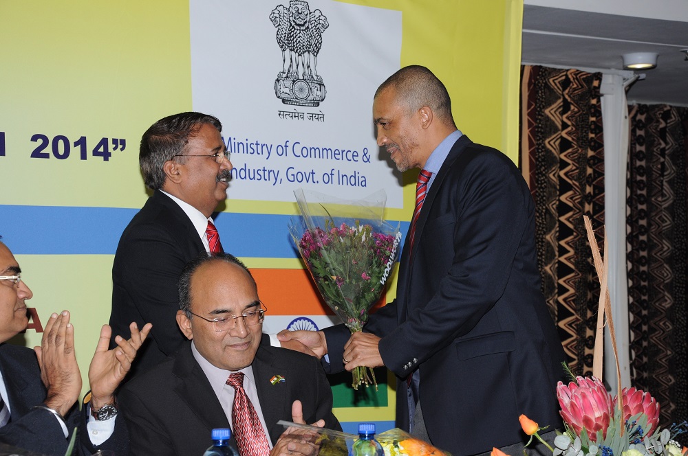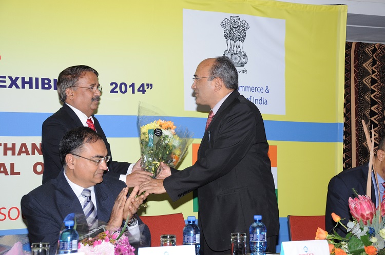 H.E. Mr. Harsha Vardhan Singh Negi, Hon’ble Consul & HoC, Consulate General of India, Durban who was the Guest of Honour at the Inaugural function of the Indian Chemical & Cosmetics Exhibition held on 9th Sept. 2014 at Durban, is being welcomed by CHEMEXCIL with a bouquet of flowers.