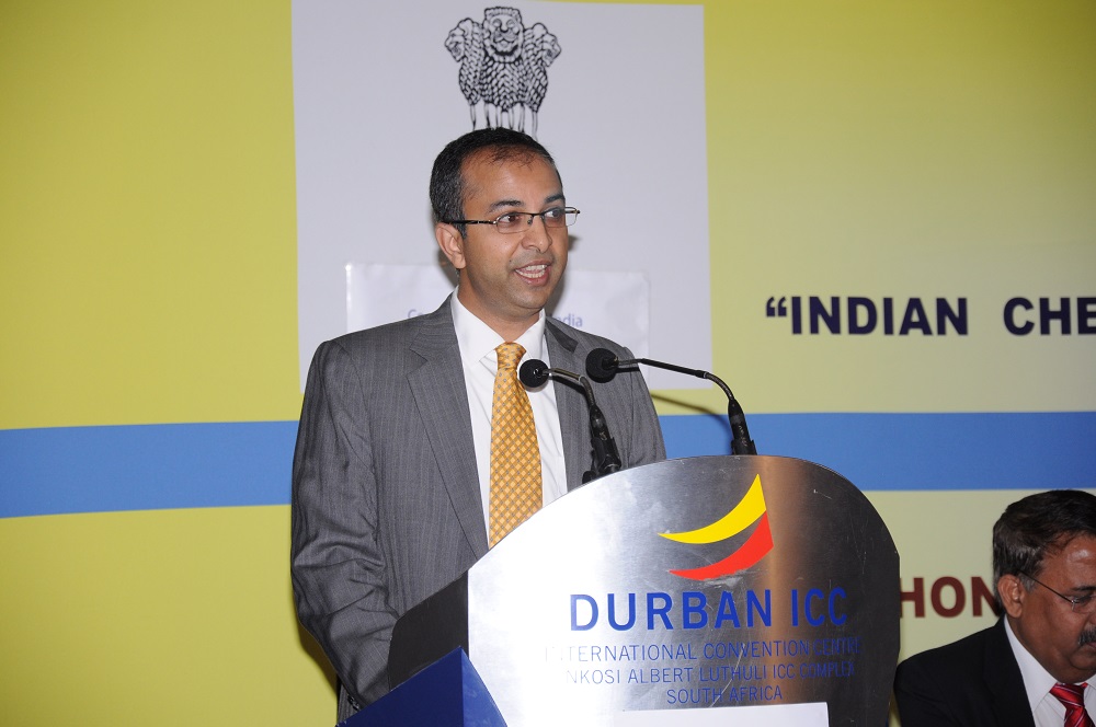 Mr. Akash Singh, President of Durban Chamber of Commerce & Industry who was the Guest of Honour at the Inaugural function of the Indian Chemical & Cosmetics Exhibiton held on 9th Sept. 2014 at Durban, S. Africa address the gathering.