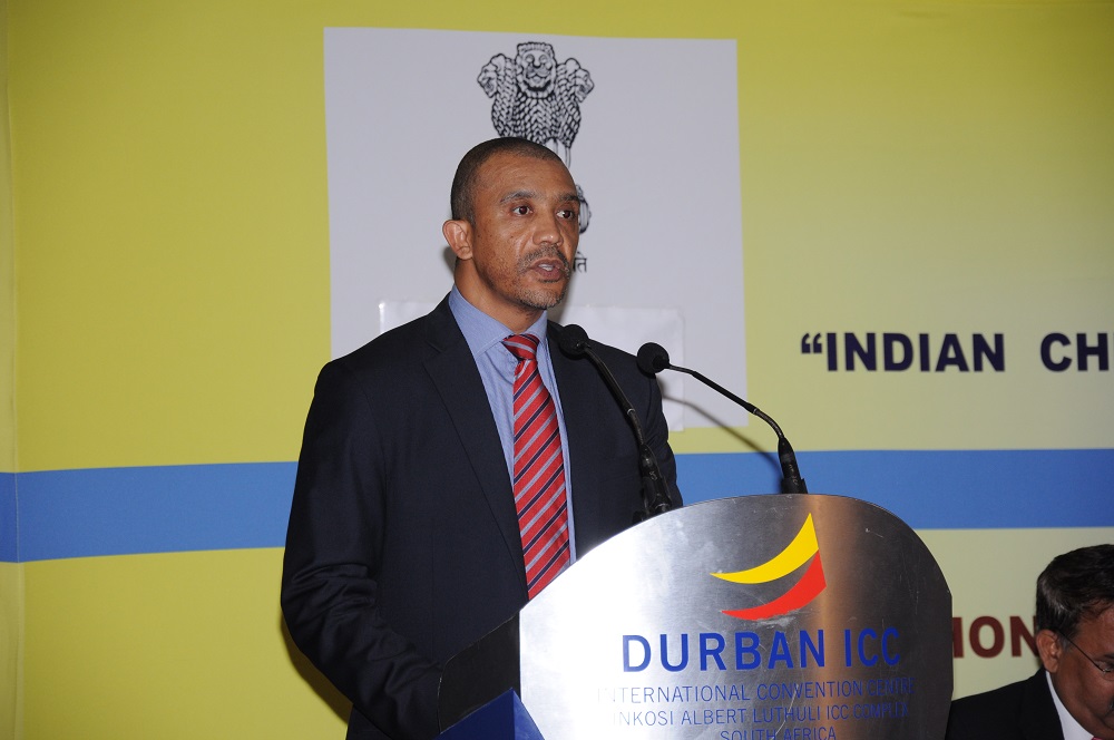 Mr.Lester Bouah, Export Development & Promotion Executive Manager, Trade & Investment of KwaZulu Natal who was the Guest of Honour at the Inaugural function of the Indian Chemical & Cosmetics Exhibiton held on 9th Sept. 2014 at Durban, S. Africa address the gathering.